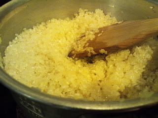 | 玉葱が十分しんなりしたら、 ②米を加えて、熱くなるまで炒める。 (米は洗わない。そのまま炒める。) 焦げやすいので、ヘラでしっかり混ぜながら炒める。 米をぎゅっと指で握って、「熱い!」って感じるまで熱する。 米を炒め始めるときに、 湯を沸かし始めるとタイミングバッチリだ。 |