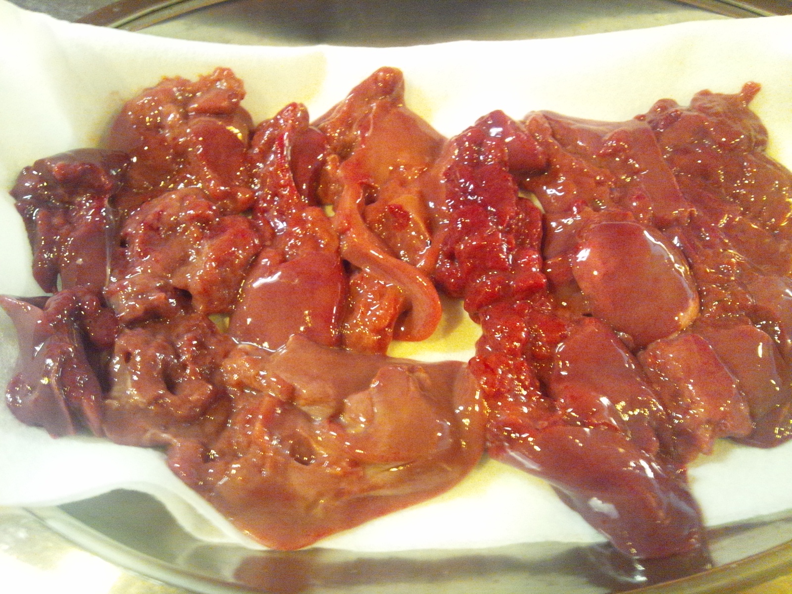 鶏レバーの筋とその下にある血管を取り除き、 冷水にさらす。 きれいになるまで、何度か水を入れ替る。 必ず、氷水で。 温度の上昇はレバーの匂いのもと。 足の速い食材だから気を付ける。 |